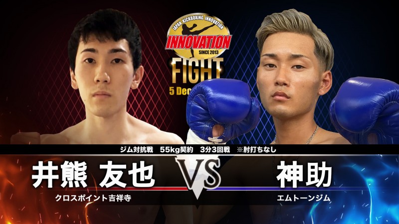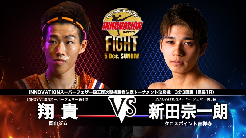今年9月20日、INNOVATION新宿FACE興行「Resistance-3」で行われたINNOVATIONスーパーフェザー級王座次期挑戦者決定トーナメント準決勝戦で、それぞれランキング上の選手、翔貴がRIZING大輝、新田宗一郎が市村大斗をユナニマスデシジョン(判定3-0)で破り決勝進出を決め、このリングで相対峙します。破天荒なキャラクターで“岡山名物”を自ら喧伝する傾奇者、翔貴。沖縄出身で無敗(10戦7勝3KO3分)を誇る新田宗一郎。