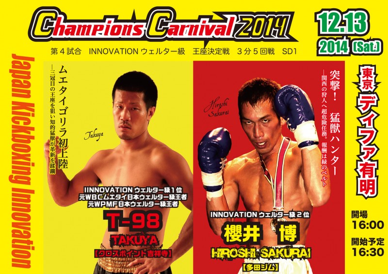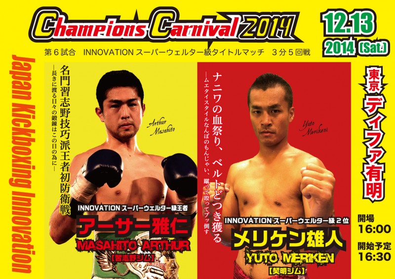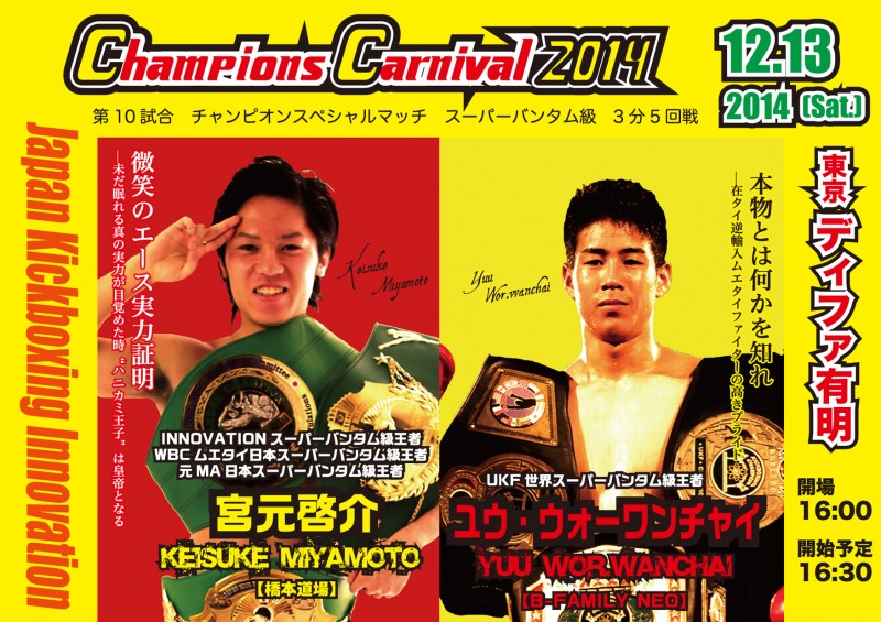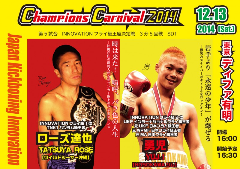 12月13日(土)ディファ有明で開催されるINNOVATION主催【CHAMPION'S CARNIVAL2014】フェザー級全日本新人王 決勝戦☆が行われる予定であったが、2014年度西日本新人王の吉...
