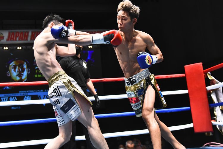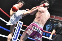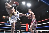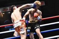 1ラウンド、速攻の左ハイキックを見舞う平松にタイトルマッチへの強い意気込みが感じられる。だが、パンチの乱打戦となると、これが得意の神助が右ストレートを直撃させ先制ダウンを奪取。立ち上がった平松は、気丈にパンチで逆前進すると神助がテンカオを突き突き刺す技巧を見せる。追い詰められながらもパンチで打ち合いを誘う血気盛んなチャンピオンのそれに神助はここぞとばかりに応じる中、波乱の初回終了ゴング。2ラウンド、先ほどの展開が続行するかのように激しくパンチで打ち合いとなり、神助の左フックがクリーンヒットし平松ダウン。そこから立ち直した平松がまたも左フックを喰らいダウン。それでも立ち上がり更なる乱打戦に臨むも神助の左フックは平松を昏倒させ、前のめりに倒れる。結果、スリーノックダウンで神助が激烈なKO勝ちで鮮やかにベルトを奪取。相当の数来場した応援団と気炎を上げた。